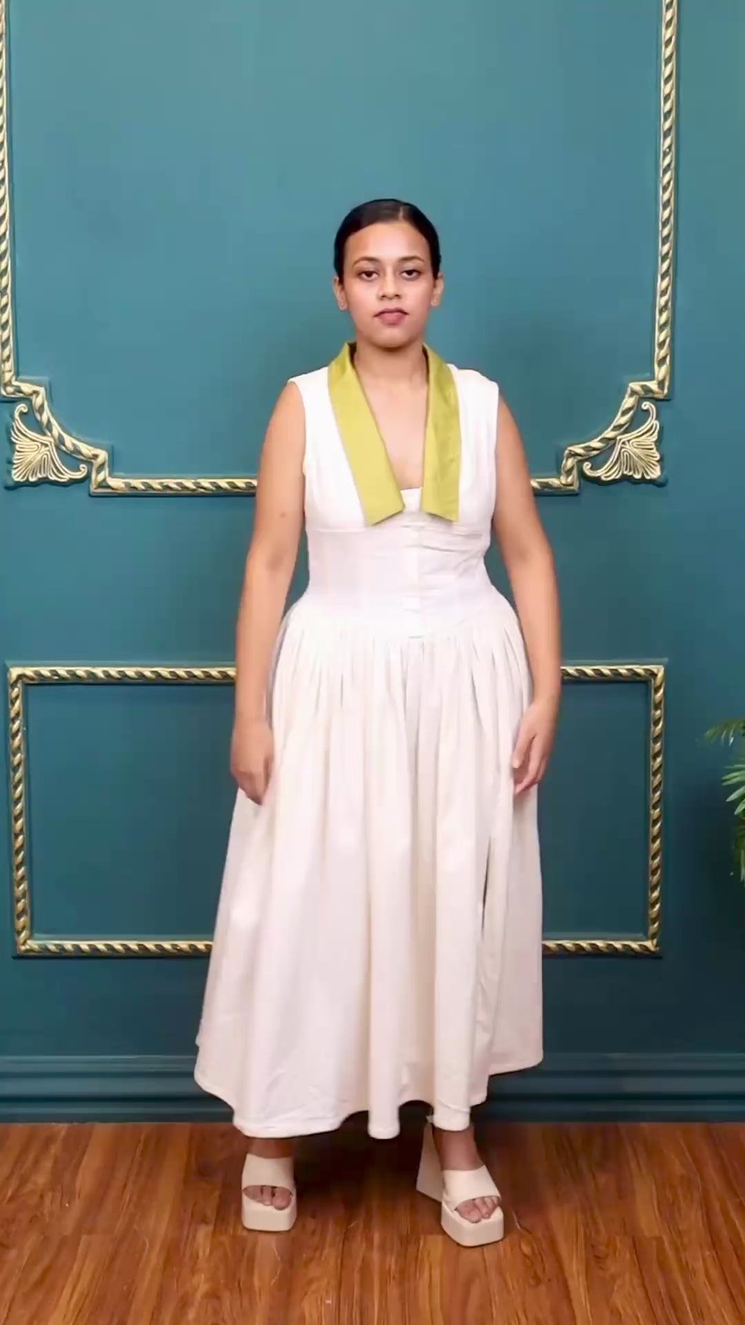 The design features elongated statement collars in muted olive, framing a corset-inspired bodice (without boning) that shapes gently without restriction. Inside, a bralet tube offers added structure and layering ease. Flowing into a gathered skirt with a thigh-high slit, Selene brings an elegant balance of poise and modern allure.